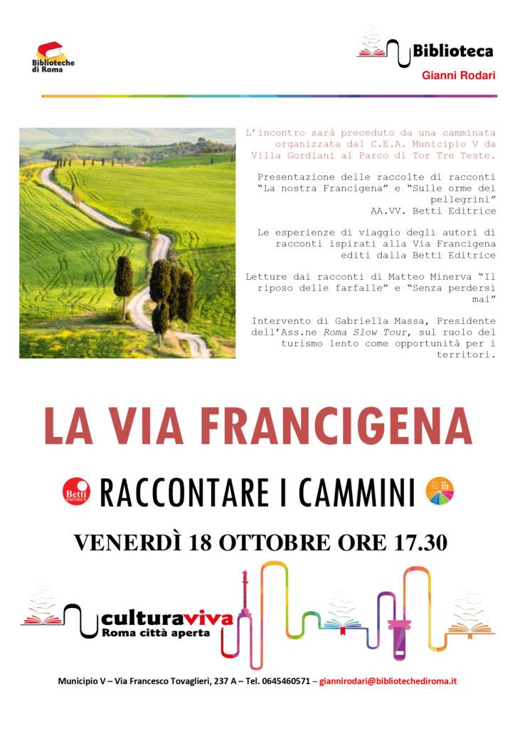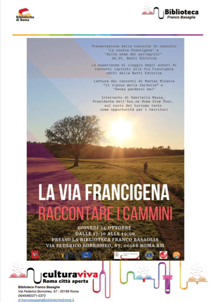 - Venerdì 18 ottobre, alle ore 17.30, alla biblioteca Gianni Rodari in via Francesco Tovaglieri 237 A, a Tor Tre Teste -ROMA. Intervento di Gabriella Massa, Presidente dell’Ass.ne Roma Slow Tour, sul ruolo del turismo lento come opportunità per i territori. L’incontro sarà preceduto da una camminata organizzata dal C.E.A.