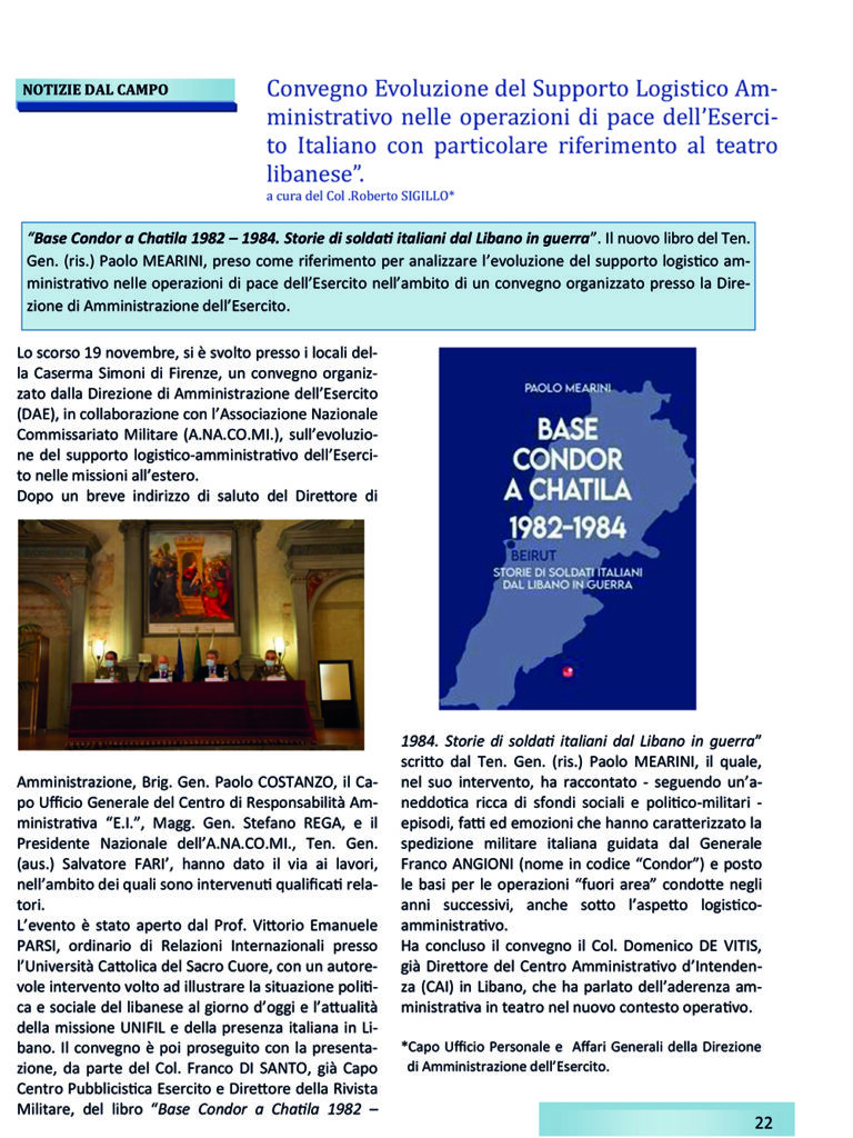 “Base Condor a Chatila 1982 – 1984. Storie di soldati italiani dal Libano in guerra”. Il nuovo libro del Ten. Gen. (ris.) Paolo MEARINI, preso come riferimento per analizzare l’evoluzione del supporto logistico amministrativo nelle operazioni di pace dell’Esercito nell’ambito di un convegno organizzato presso la Direzione di Amministrazione dell’Esercito.