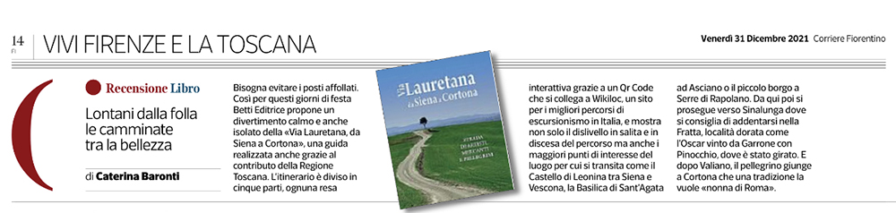 «Bisogna evitare i posti affollati. Così per questi giorni di festa Betti Editrice propone un divertimento calmo e anche isolato della “Via Lauretana, da Siena a Cortona”, una guida realizzata anche grazie al contributo della Regione Toscana. L’itinerario è diviso in cinque parti, ognuna resa interattiva grazie a un Qr Code che si collega a Wikiloc, un sito per i migliori percorsi di escursionismo in Italia, e mostra non solo il dislivello in salita e in discesa ma anche i maggiori punti di interesse del luogo per cui si transita come il Castello di Leonina tra Siena e Vescona, la Basilica di Sant’Agata ad Asciano o il piccolo borgo a Serre di Rapolano. Da qui in poi si prosegue verso Sinalunga dove si consiglia di addentrarsi nella Fratta, località dorata come l’Oscar vinto da Garrone con Pinocchio, dove è stato girato. E dopo Valiano, il pellegrino giunge a Cortona che una tradizione la vuole “nonna di Roma”».
