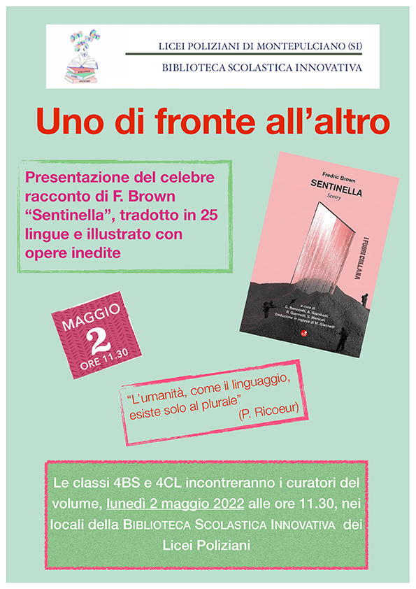 Lunedì prossimo, 2 maggio, alle ore 11.30, presso la Biblioteca Scolastica Innovativa dei Licei Poliziani di Montepulciano, sarà presentato il testo curato da G. Benedetti, A. Giambetti, R. Giannetti, S. Menicali, Sentinella, di J. Brown.